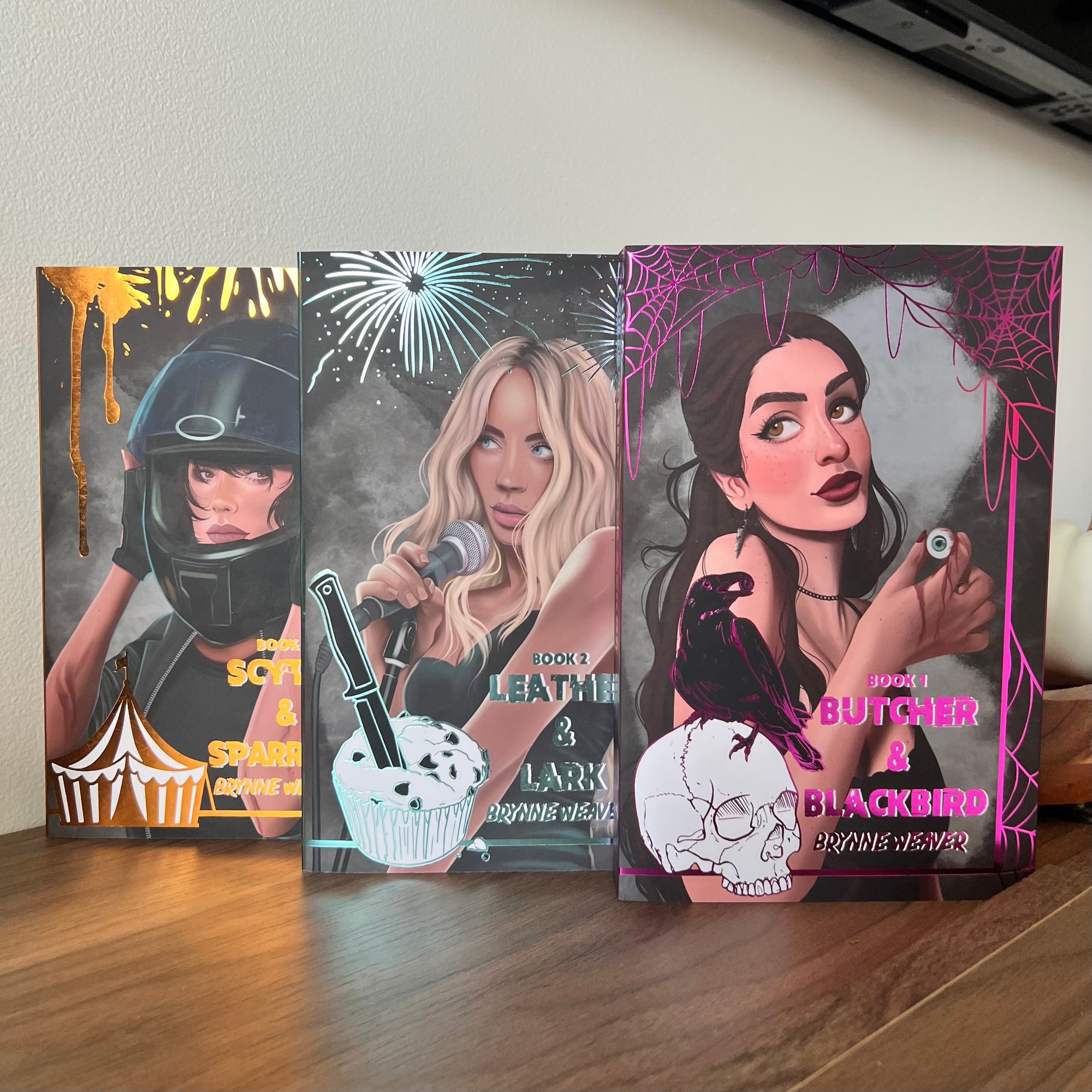 Hands down some of the most beautiful dust jackets I own. The gold foiling is so eye catching and the artwork itself is just *chef's kiss* I haven't been able to stop staring at them all day. Genuinely can't recommend these enough. This was also my first purchase from this artist and I have no complaints at all about the buying and shipping process. All in all I'm so thrilled I bought these.